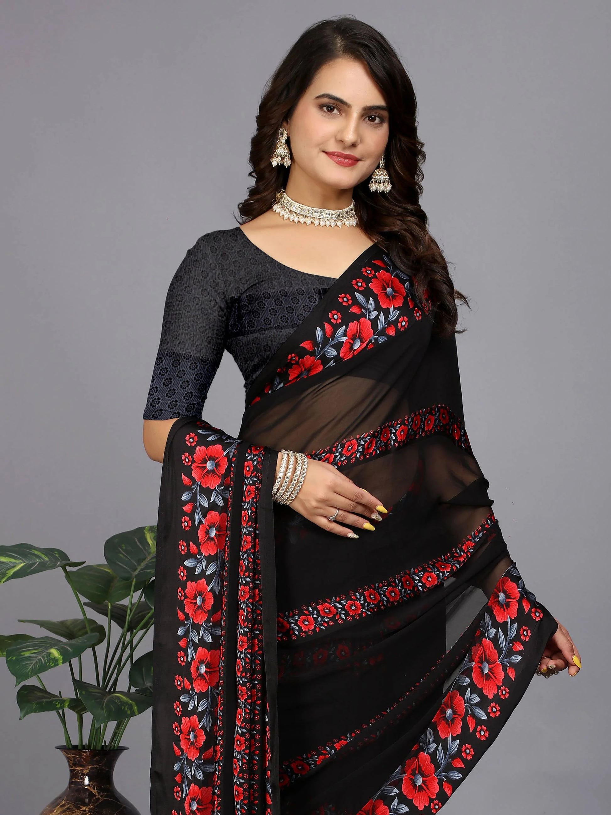 Red And Black Floral Print Daily Wear Chiffon Saree